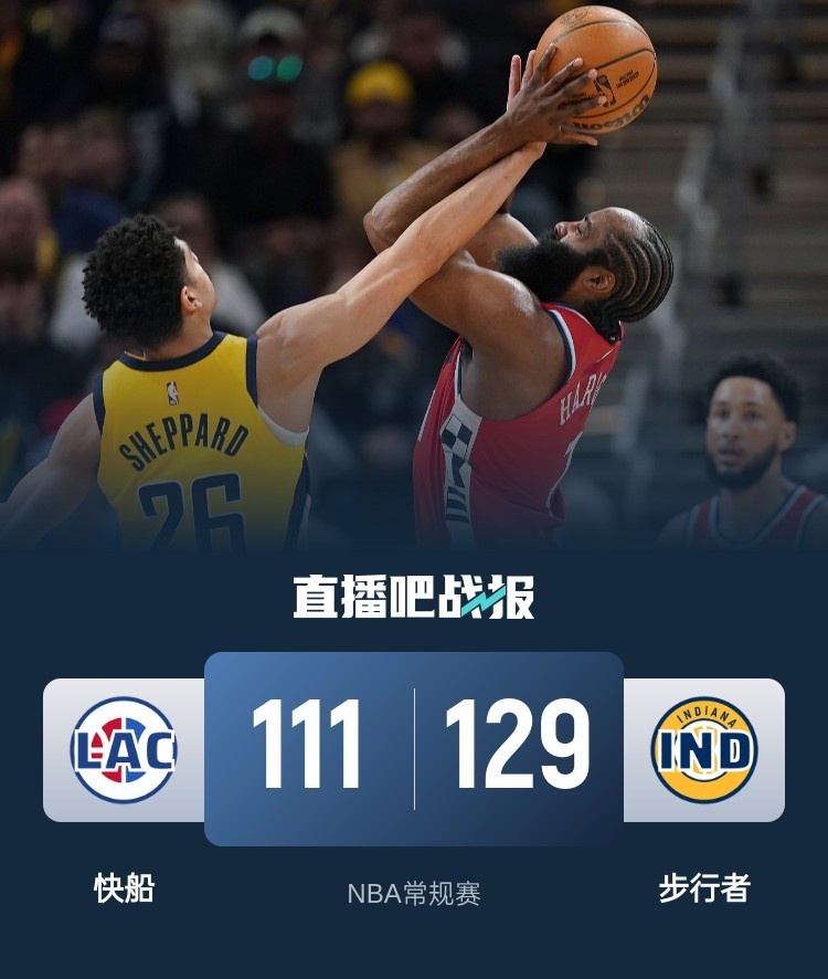 小卡缺阵 哈登31+7+11 哈利伯顿29+12 快船遭步行者双杀
